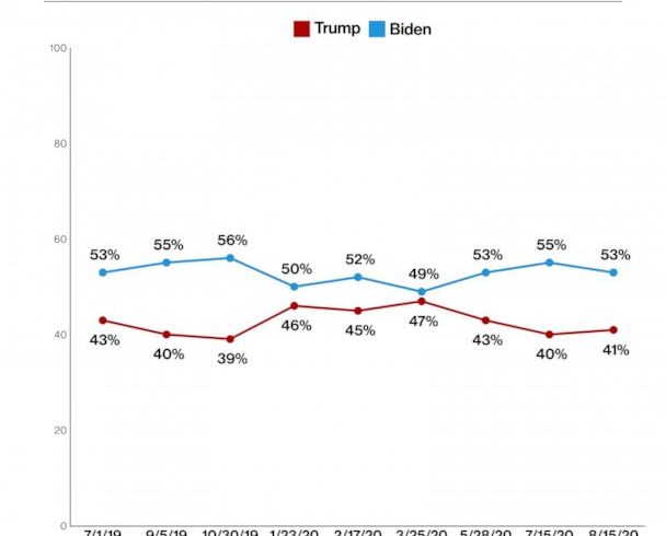 This ABC News/Washington Post poll was conducted by landline and cellular telephone August 12-15, 2020, in English and Spanish, among a random national sample of 1,001 adults. Results have a margin of sampling error of 3.5 points, including the design effect. Partisan divisions are 31-26-37%, Democrats-Republicans-independents.
