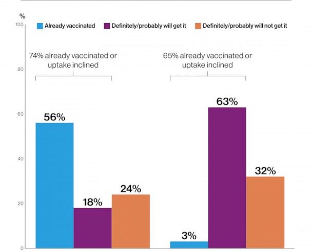Trust is a factor in uptake: Among those who see all three vaccines as very safe, 98% intend to get vaccinated or have done so. That falls to 66% of those who don’t have an opinion on one or more vaccine’s safety, and 58% of those who see at least one as unsafe.